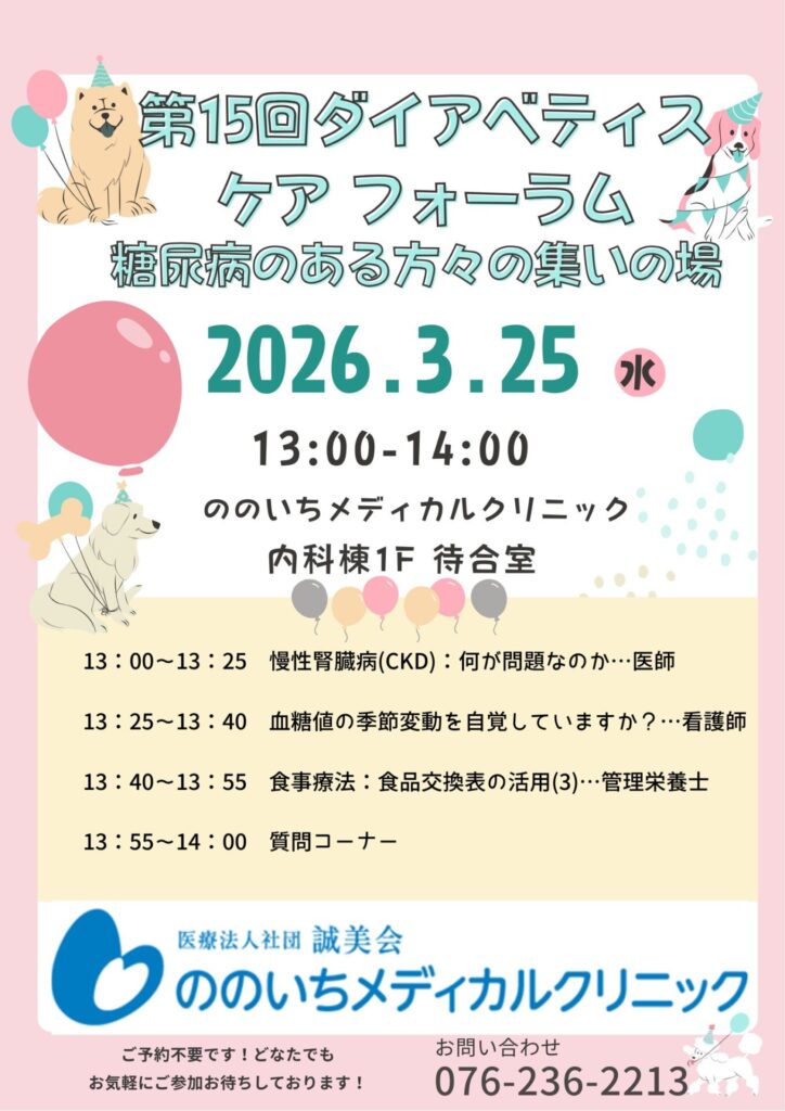 2026.03.04 糖尿病内科からお知らせ 2026年 3月 第15回 ダイヤベティス・ケア フォーラム 3月25日(水) 13:00~14:00 内科棟待合室にて第15回 ダイアベティス・ケア フォーラム を開催します。 医師・看護師・管理栄養士と一緒に日ごろの疑問や生活の工夫などをざっくばらんにみなさんとお話できる時間も設けています。 予約不要ですので、お気軽にご参加ください。